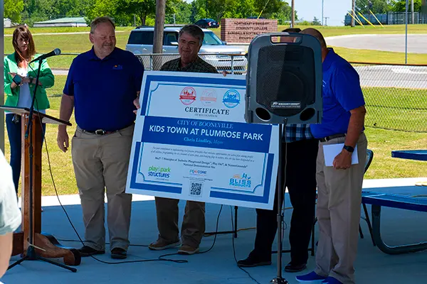 “This new Kids Town installation will inspire new memories with many accessible play areas,” said Chris Lindley, Mayor of Booneville, Mississippi. He continued by saying, “It was time to update the old Kids Town playground due to an aging structure and poor visibility.