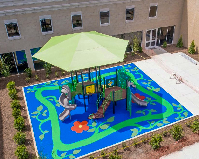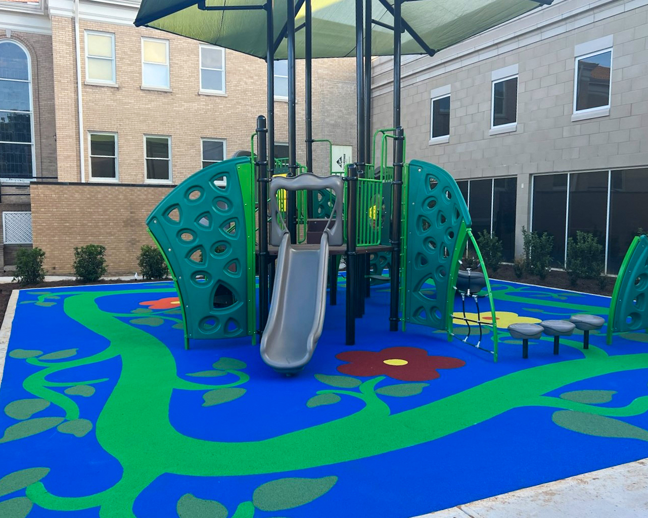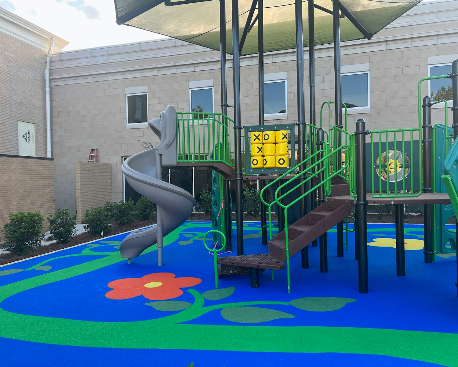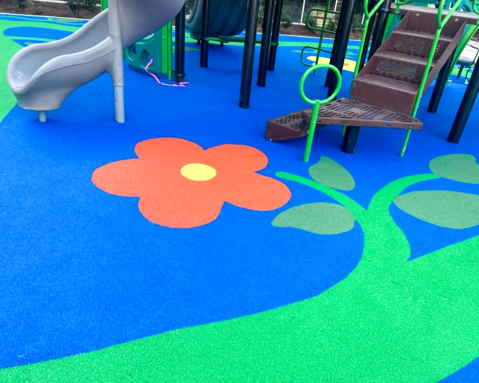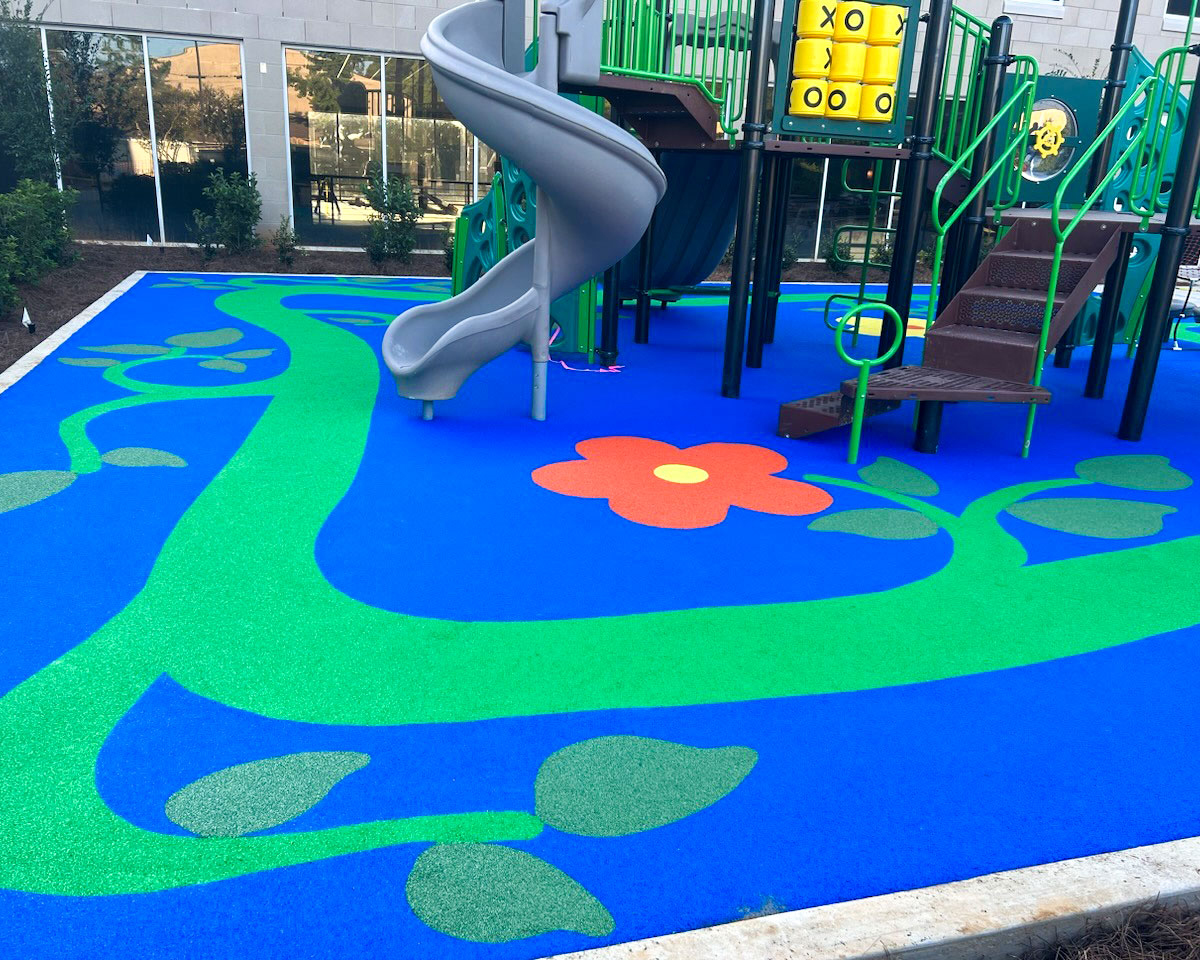 Using custom stencils and hand mapping the graphics, our installers were able to execute it perfectly! The customer was very pleased with the final poured in place surfacing with its vibrant colors and playful aesthetic.