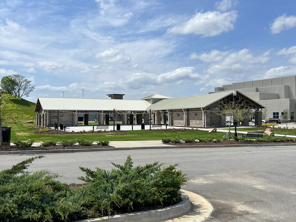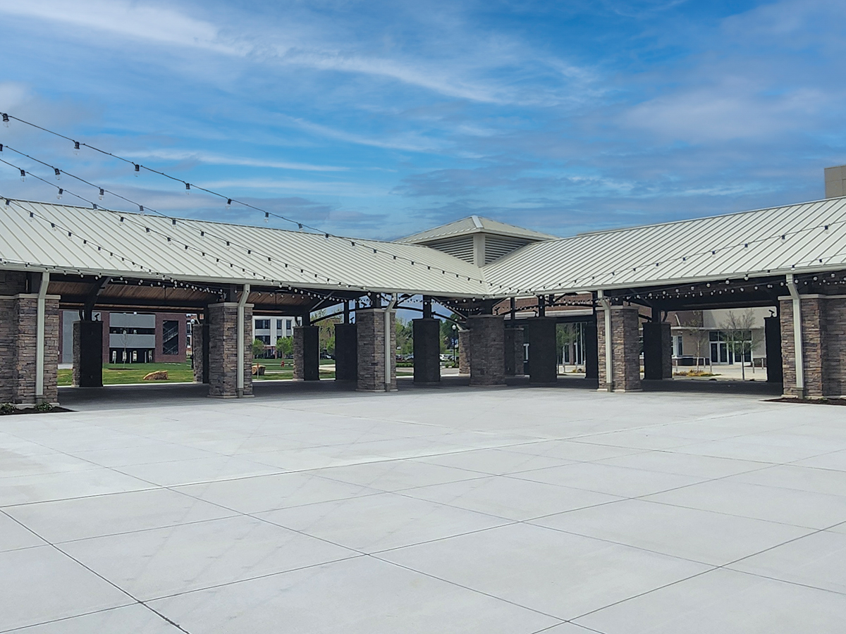 This recently completed Market Pavilion at The Plaza, adjacent to the Performing Arts Center in Evans, spans 16,000 square feet. It includes a 9,300-square-foot covered area and a 6,000-square-foot patio.