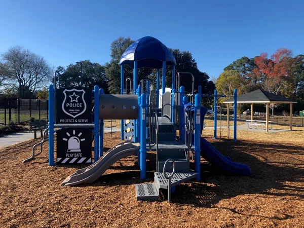 Deputy Chief, Patrick Gallagher, decided that this was an excellent opportunity to include the surrounding community by developing a new playground. This playground is designed to build a positive relationship between the citizens and the police department in the area. One of the things Bliss did was provide some unique custom-designed side panels on the outskirts of the play structure letting the community know they are safe and protected during play at all times by Virginia Beach 4th Precinct.